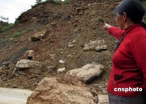 圖為3日記者在趕往災區(qū)途中,行至云南南澗縣至景東縣的公路邊,當?shù)匾晃淮迕裰v述2日泥石流發(fā)生時的景象。