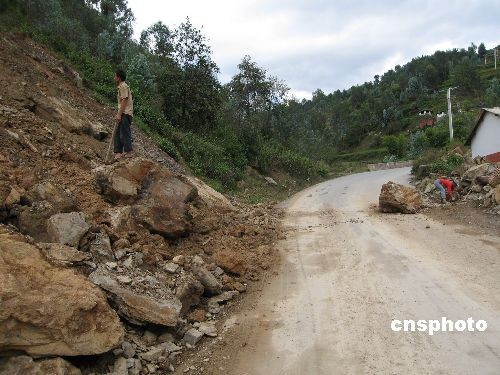 圖為3日記者在趕往災區(qū)途中,行至云南南澗縣至景東縣之間通過一條剛剛疏通的的公路。