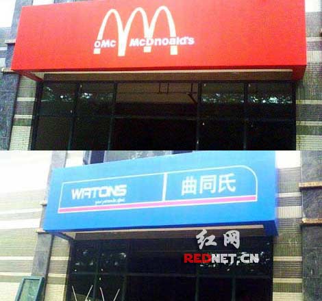 紅網(wǎng)長沙11月9日訊(記者 耿紅仁)“這擦邊球打得很牛很雷人,真是山寨店鋪大薈萃啊!”8日晚上,網(wǎng)友“鍋爐工”在紅網(wǎng)論壇發(fā)帖爆料,稱在網(wǎng)上看到一個題為《對不起,我真的被雷到了,南京最雷人山寨店群》的圖片帖,圖片顯示在南京文安街上,林立的店鋪清一色是山寨名牌店鋪,其中屈臣氏、必勝客、麥當(dāng)勞、李寧、星巴克、哈根達(dá)斯等分別被克隆成曲同氏、必勝糊、李明、巴克星、哈根波斯等。