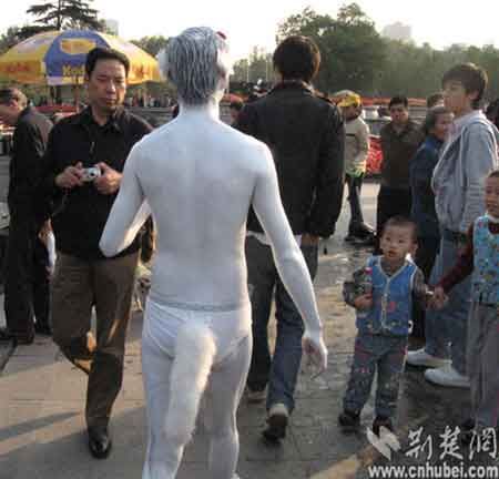 11月9日,武漢首義廣場舉行菊花展,晴朗的天氣給前來觀賞菊花的市民帶來了方便,市民紛紛拿出自己的相機(jī),用鏡頭將菊花與自己定格在一種美妙的記憶里。此時(shí)一名男子裸身走進(jìn)菊花展現(xiàn)場,在菊花叢中展示了人體藝術(shù),試圖將自身與大自然融合起來。此舉引來不少市民圍觀猜議。市民王先生說:“花展是公共場所,在菊花叢中展示人體藝術(shù),與主題不符,不太妥當(dāng)。”