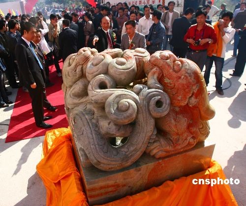 11月15日上午,毛澤東龍鈕大印啟運(yùn)儀式在福建福州晉安區(qū)新店民營工業(yè)區(qū)藏天園一樓舉行。壽山石作為世界上獨(dú)有的珍貴彩石,兼具“細(xì)、結(jié)、潤、膩、溫、凝”六德,以質(zhì)地最好、品種最多、色彩最豐富、開發(fā)利用歷史最悠久、雕刻工藝最高、影響最廣泛而聞名于世,歷代帝王均以壽山石為印璽。毛澤東龍鈕大印作為新落成的毛澤東紀(jì)念館鎮(zhèn)館之寶。該印重達(dá)5噸,寬度為1150毫米,寓意毛澤東今年誕辰為115周年,印章高為1226毫米寓意毛澤東出生時(shí)間12月26日,整個(gè)印章為一塊完整壽山原石雕刻而成。該原石由一個(gè)30多噸重的壽山石胚,由幾十名藏天園工藝師經(jīng)過一個(gè)多月日夜雕刻而成。中新社發(fā) 祝敏松 攝