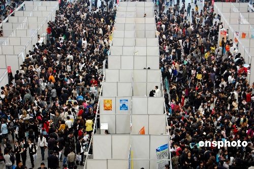 11月15日,由重慶市大學(xué)中專畢業(yè)生就業(yè)指導(dǎo)服務(wù)中心聯(lián)合學(xué)校、企業(yè)與職業(yè)生涯發(fā)展機構(gòu)等多方力量,共同為09屆的高校畢業(yè)生籌劃舉辦的雙選會系列活動,首場也是規(guī)模最大的一場雙選會在陳家坪展覽中心舉行,萬余人次09屆畢業(yè)生參加。 從招聘會上看到,由于受到全球金融危機的影響,企業(yè)紛紛“瘦身”,大幅縮減招聘人數(shù),畢業(yè)生面臨“僧多粥少”的局面,就業(yè)遭遇寒流。中新社發(fā) 許康平 攝