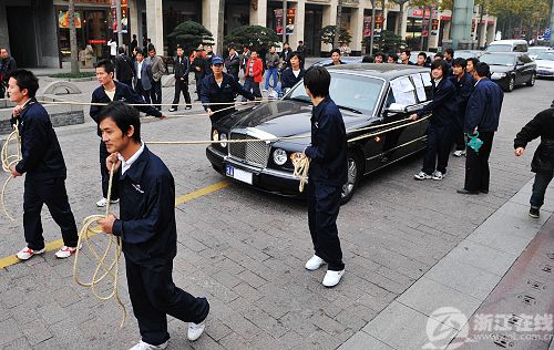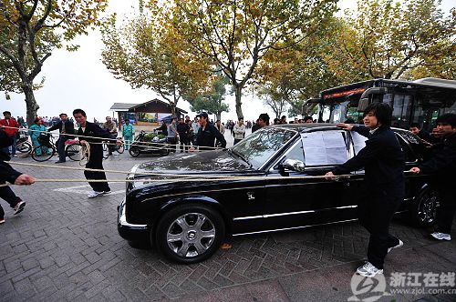 17日,杭州,20多人拉著一輛價值500多萬的高檔豪華轎車,在西湖邊向路人展示這輛豪華轎車的名不副實。