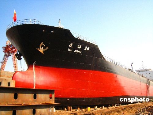 11月20日,一艘由中國農(nóng)民制造的最大貨船,屹立在南京浦口“十里造船帶”的造船廠碼頭準(zhǔn)備下水。這艘由“中華民間造船水運(yùn)第一村”南京武家嘴村農(nóng)民制造的貨船載重1.6萬噸、長146.2米、寬22米、進(jìn)深11米,是迄今全國農(nóng)民中造出的最大貨船。中新社發(fā) 谷昌旺 攝