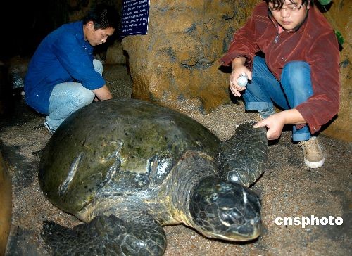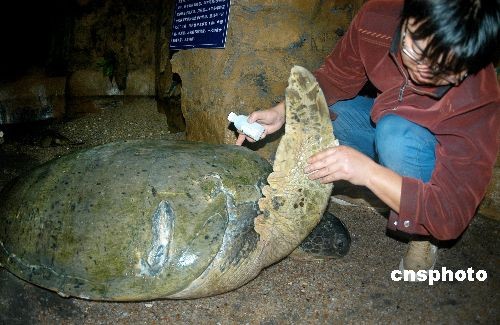 11月22日,綠海龜靜靜趴在溫度適宜的暫養(yǎng)池里,水族館技術人員用藥為它治療傷口。日前,江蘇連云港市連島水族館收治了一只巨型綠海龜,經過幾日精心救治,這位超過100歲的老壽星會慢慢地將頭抬起來。據介紹,這只海龜長約160厘米,寬約100厘米,頭部、右前方和左后方龜蓋上有明顯傷痕,可能是在海水里被螺旋槳劃傷的,伸手觸摸可以摸到肉,在剛接來時右后腿還在流血,眼睛也受感染。水族館收治后,派三位專人悉心照料,待傷情恢復后再放歸大海。這只巨型綠海龜是贛榆縣宋莊鎮(zhèn)漁民在收網時無意中捉到的。中新社發(fā) 王春 攝