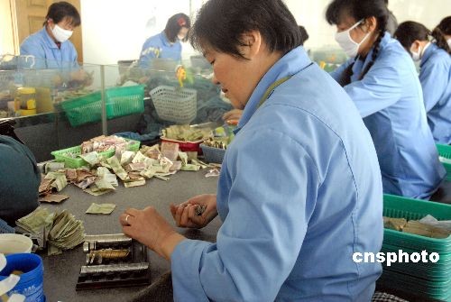 昆明公交公司共有196條無人售票公交線路,3200臺(tái)公交車,今年以來,平均每月都會(huì)收到近10萬元的假硬幣,僅此一項(xiàng)公交公司每年就要虧100多萬。圖為昆明公交公司收銀中心點(diǎn)鈔員正在點(diǎn)鈔。中新社發(fā) 蔣晨 攝