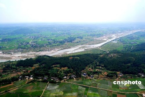 北川新縣城所選位置與綿陽市安縣黃土鎮(zhèn)接壤之處,北距北川老縣城約33公里,比原定的黃土鎮(zhèn)板凳橋距離老縣城近了約6公里;南距綿陽市區(qū)約32公里,安昌鎮(zhèn)與永安鎮(zhèn)間東側(cè),具體位置尚未透露。圖為航拍的永安鎮(zhèn)與安昌鎮(zhèn)之間地貌。中新社發(fā) 胥輝 攝