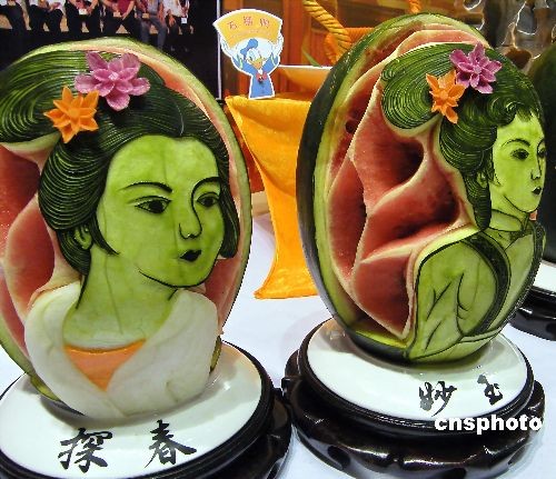 2008年11月27日,上海餐博會中展出用西瓜雕刻而成的《紅樓夢》人物臉譜。中新社發(fā) 井韋 攝