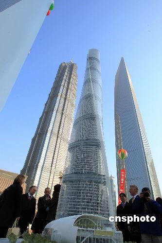 11月29日,中國第一高樓——“上海中心”在上海陸家嘴金融貿(mào)易區(qū)腹地開工,該超高層建筑總高度將達(dá)632米,將與毗鄰的超高層建筑“金茂大廈”、“環(huán)球金融中心”,形成“三足鼎立”美景,圖為開工儀式上,中外嘉賓搶先觀賞這一“上海新景觀”。據(jù)介紹,“上海中心”總投資額預(yù)估高達(dá)148億元人民幣,外觀螺旋造型象征中國和諧的文化精神。預(yù)計2012年結(jié)構(gòu)封頂且部分投入運(yùn)營,2014年竣工交付使用。中新社發(fā) 潘索菲 攝