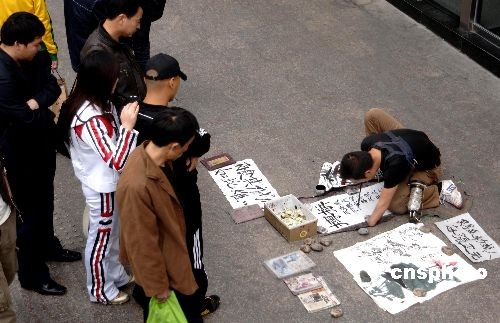 12月4日,左手小臂以下被截肢,右臂高位截肢的廣西男子劉國強,在福州鬧市街頭口含毛筆作畫掙錢。2002年,劉國強在農(nóng)村家里打谷發(fā)生意外導(dǎo)致雙手截肢,之后他開始口銜毛筆寫字作畫掙錢謀生。中新社發(fā) 王東明 攝