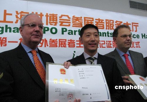 12月5日,中國2010年上海世博會首批境外參展者完成主體登記,獲頒證照。此舉標(biāo)志著上海世博會面向全球的參展服務(wù)啟動。圖為荷蘭展區(qū)總代表魏偉勵(左一)、盧森堡展區(qū)副總代表費瑞朋(右一)等從上海官員手中接過營業(yè)執(zhí)照等。中新社發(fā) 許曉青 攝