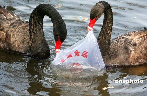 2008年12月6日,冬日暖陽(yáng)下的蘇州動(dòng)物園迎來(lái)不少游客。然而,在該園池塘里戲水游弋的幾只黑天鵝面對(duì)少數(shù)不文明游客亂扔并漂浮水面的塑料薄膜食品袋,既好奇又犯了難:天鵝們仿佛想從中尋找食物而用嘴含啄、吞咽,或竭力撕扯也無(wú)濟(jì)于事。后來(lái),在場(chǎng)目睹此情景的幾名好心游客為以防不測(cè),請(qǐng)來(lái)飼養(yǎng)管理人員將食品袋從水中一一撈起。 蘇州動(dòng)物園飼養(yǎng)管理人員敬告,游客應(yīng)文明游園,善待動(dòng)物,切莫如此戲弄或傷害可愛(ài)的黑天鵝。中新社發(fā) 蘇秀 攝