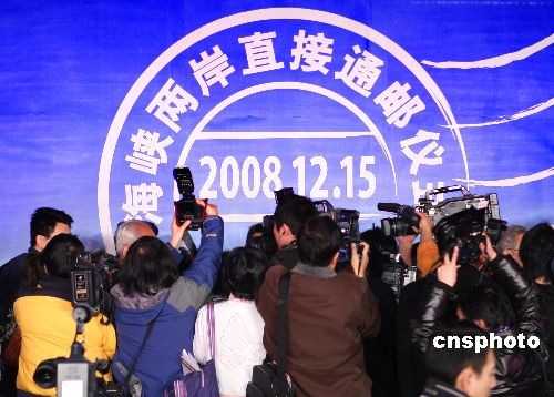 12月15日,由國家郵政局、國務院臺灣事務辦公室、北京市政府主辦、中國郵政集團承辦的海峽兩岸直接通郵儀式,標志著海峽兩岸將實現(xiàn)全面、直接、雙向通郵,直接開辦各項郵政業(yè)務。大陸方面郵件封局為北京、上海、廣州、福州、廈門、西安、南京、成都,臺灣方面郵件封局為臺北、高雄、基隆、金門、馬祖。圖為通郵儀式吸引眾多境內外記者爭相采訪。中新社發(fā) 宋吉河 攝
