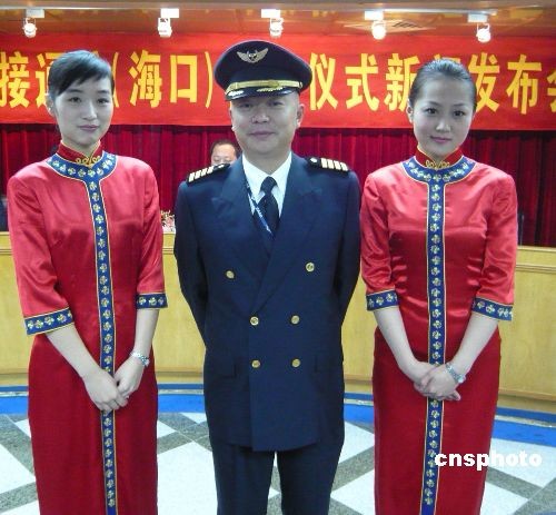 十二月二十日,?-臺北將首開直航航線。海南航空為順利完成此次首航,特別推出精干的機組人員。機長蒲明(中)曾執(zhí)飛2005年兩岸春節(jié)包機最后一個航班。乘務長和頭等艙乘務員在去年以來都曾執(zhí)飛過兩岸中秋、春節(jié)包機。中新社發(fā) 王辛莉 攝