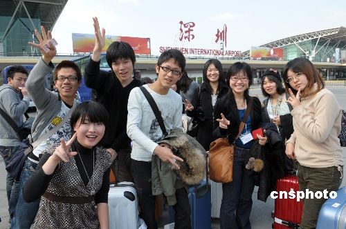 十二月二十一日,日本青少年世代友好代表團(tuán)一行百余人抵達(dá)深圳,他們將前往紅樹(shù)林、錦繡中華、民俗文化村、深圳大學(xué)、大族激光等處參觀。圖為日本大學(xué)生抵達(dá)深圳機(jī)場(chǎng)時(shí)高興地合影留念。中新社發(fā) 陳文 攝