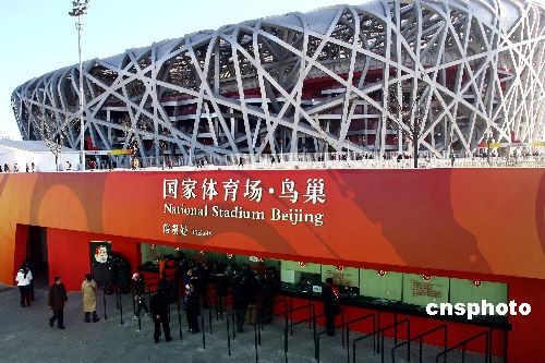 12月25日,國家體育場“鳥巢”新的售票檢票系統(tǒng)開始啟用。原臨時售票處將被設(shè)立在場館西北側(cè)的永久售票處取代,驗票方式由手工檢票變?yōu)樽詣域炂,而驗票口仍為場館的“K”、“L”口。工作人員表示,“鳥巢”的出口仍為“B”、“C”口,將根據(jù)客流量決定是否增開其他出口。圖為鳥巢新設(shè)立的永久售票處。中新社發(fā) 富田 攝