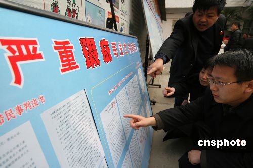 12月25日,法官在觀看有嚴重瑕疵的司法文書制成的展板。當日,為維護法院生效裁判文書的嚴肅性,提高法院的審判質(zhì)量、司法文書制作水平,該市魏都區(qū)人民法院將本省近年來存在嚴重瑕疵的司法文書制成展板作為反面教材,在法院內(nèi)部進行展示,教育廣大法官引以為戒,舉一反三,對照檢查自己在工作中存在的不足。中新社發(fā) 牛書培 攝