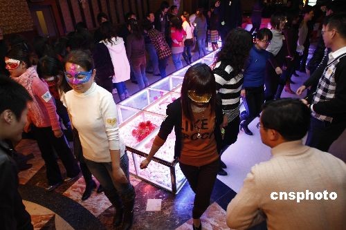 12月27日,百余名單身青年在北京參加一場(chǎng)化妝舞會(huì)。年輕人在歡快的樂(lè)曲中翩翩起舞。面具下的女青年拋開羞澀,與男舞伴竊竊私語(yǔ)。該活動(dòng)的初衷也是為了引導(dǎo)年輕人在擇偶時(shí)拋開外在條件,認(rèn)識(shí)到“相容成就幸福婚姻”才是健康婚戀理念。中新社發(fā) 楊影懿 攝