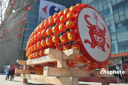 1月25日是農(nóng)歷大年三十,在鄭州市花園北路新瑪特廣場(chǎng),矗立起一座高8米、長(zhǎng)8.5米、由280個(gè)大紅燈相連所組成的“巨型迎春鼓燈”。中新社發(fā) 劉書亭 攝