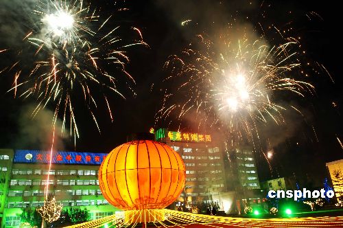 1月25日除夕夜,東北特鋼集團(tuán)大連基地廣場(chǎng)五彩繽紛禮花綻放空中,迎接牛年到來(lái)。當(dāng)晚,大連市大街小巷爆竹聲聲,人們?cè)诮k爛的煙花中迎來(lái)2009農(nóng)歷新年。中新社發(fā) 劉德斌 攝