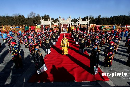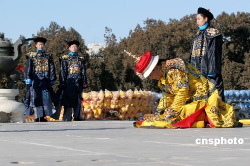 1月26日農(nóng)歷正月初一,第24屆地壇春節(jié)文化廟會如期舉行,廟會歷時8天,至2月1日截止。每年地壇廟會,地壇公園芳澤壇都會舉行場面宏大的仿清祭地表演,“皇帝”帶領(lǐng)文武百官、侍衛(wèi)儀仗等200余人身著盛裝祭祀,祈求地神保佑、國泰民安、風(fēng)調(diào)雨順、五谷豐登,今年的祭地表演則因為“草根皇帝”的海選而備受關(guān)注。從普通市民中遴選出來的“草根皇帝”李少華正式上任,迎神送神、三叩九拜,在數(shù)百游園觀眾的注視下,黃袍加身的李少華邁著堅定的步伐,完成了一次皇家禮儀文明之旅。中新社發(fā) 富田 攝