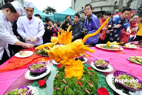 1月29日,杭州清河坊歷史街區(qū)舉辦“全牛宴”展評活動,街區(qū)內(nèi)十余家老字號餐飲業(yè)名店推出與“牛”有關(guān)的各式創(chuàng)新菜肴,由現(xiàn)場市民百姓品嘗并評選出“最牛”菜肴,展示老字號企業(yè)以創(chuàng)新創(chuàng)意迎牛年牛市的自信姿態(tài)。 中新社發(fā) 李忠 攝