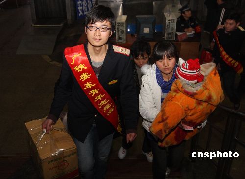 1月29日,湖南省婁底車務(wù)段的青年志愿者在婁底火車站為攜帶許多行李等老弱病殘等旅客提供各種幫助。當(dāng)日,湖南省婁底火車站迎來(lái)節(jié)后返程客流小高峰,婁底車務(wù)段團(tuán)委組織近千名團(tuán)員青年志愿者開展“和諧春運(yùn)”活動(dòng),在管區(qū)內(nèi)的車站設(shè)立了被旅客稱為“愛心島”的青年志愿者服務(wù)站,為旅客提供溫馨服務(wù)。中新社發(fā) 郭國(guó)權(quán) 攝