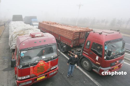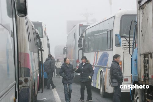 2009年2月1日上午,在同三高速公路江蘇省贛榆縣出口處,車輛等待霧散通行。連日來,江蘇省大部分地區(qū)遭遇持續(xù)大霧天氣,部分地區(qū)能見度不足50米,給旅客出行及運(yùn)輸帶來影響。當(dāng)?shù)貧庀蟛块T發(fā)布大霧黃色預(yù)警,交通安全部門提醒旅客要注意出行安全。中新社發(fā) 司偉 攝