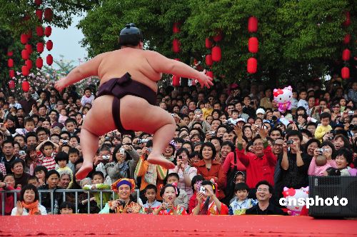 2009年2月1日,日本相撲手為廣大游客表演。第二屆廣州(番禺)櫻花文化節(jié)自1月26日在大夫山森林公園開幕以來,每天吸引數(shù)萬游人;顒映擞墟弊湘碳t的櫻花觀賞外,還有豐富多彩的表演。本屆櫻花文化節(jié)將于3月15日閉幕,歷時49天。中新社發(fā) 盤石 攝