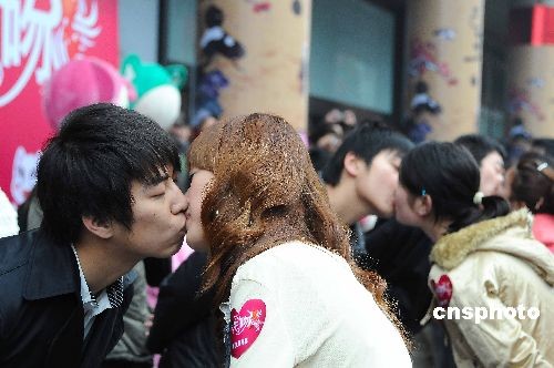 2月14日,杭州市首屆情人節(jié)“牛吻”大賽在武林銀泰、西湖銀泰、杭州百貨大樓三地同時(shí)舉行,活動(dòng)吸引了80對(duì)情侶前來參加。 中新社發(fā) 引煒