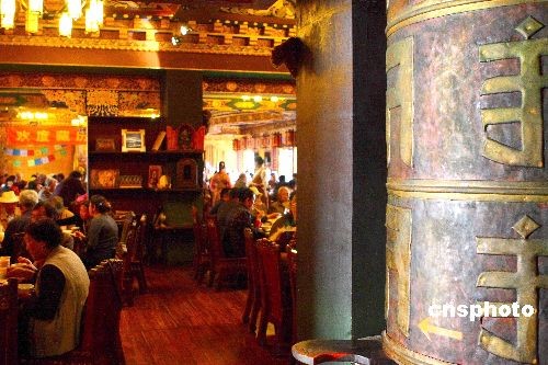 隨著在昆明定居的藏族民眾越來(lái)越多,獨(dú)具特色的藏族飲食也越來(lái)越受到昆明市民的喜愛(ài),酥油茶、青稞酒和牦牛肉這些來(lái)自藏區(qū)的綠色食品更是受到熱捧。圖為藏歷新年期間,昆明最有名的“瑪吉阿米香格里拉風(fēng)情宮”藏式餐廳人滿為患,昆明市民紛紛到此感受藏歷新年的別樣風(fēng)情。中新社發(fā) 劉冉陽(yáng) 攝