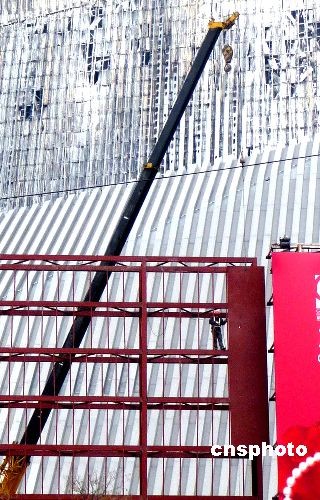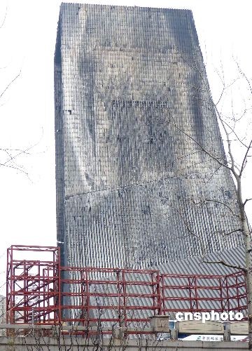 2009年2月26日,北京中央電視臺新址火災(zāi)北配樓旁,工人正在搭建腳手架和圍擋,準(zhǔn)備拆卸被燒毀的外殼進(jìn)行修復(fù),預(yù)計今年內(nèi)完工。中新社發(fā) 玉龍 攝