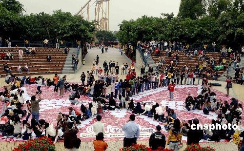 三月一日,為慶!叭恕眿D女節(jié)的即將到來(lái),三百多名女士齊聚廣州長(zhǎng)隆歡樂(lè)世界挑戰(zhàn)“人肉多米諾”骨牌。圖為蝴蝶形狀的骨牌圖案逐漸散開(kāi),場(chǎng)面壯觀。中新社發(fā) 劉衛(wèi)勇 攝