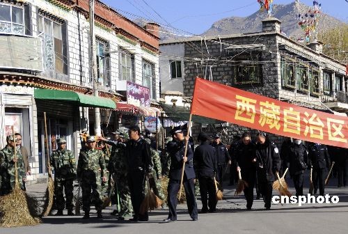 3月7日,西藏民警在拉薩東城清掃街道,為民眾服務。中新社發(fā) 廖攀 攝