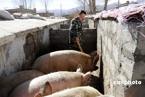 3月初,武警士兵鄭金雷在武警西藏總隊(duì)拉薩支隊(duì)尼木縣中隊(duì)豬舍里工作。鄭金雷來自浙江嘉興家財(cái)上千萬元的富裕家庭,在西藏已當(dāng)兵兩年。中新社發(fā) 廖攀 攝