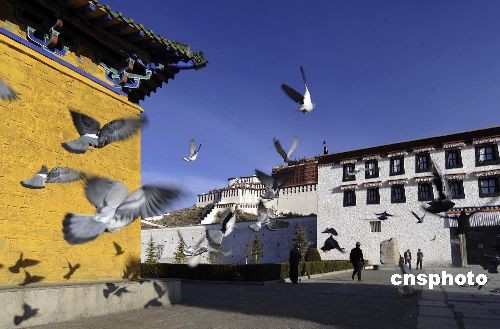 3月10日上午,西藏拉薩布達(dá)拉宮前群鴿飛翔,氣氛祥和。中新社發(fā) 廖攀 攝