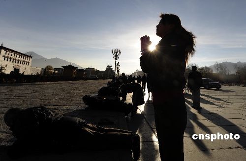 3月10日上午,西藏拉薩布達拉宮前的信眾正在虔心祈禱,布宮廣場氣氛祥和。中新社發(fā) 廖攀 攝