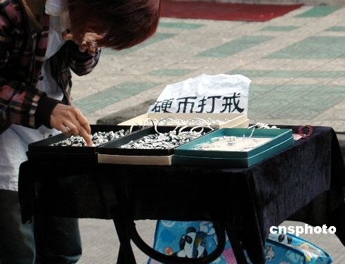 3月11日,在浙江溫嶺街頭,有人擺地攤叫賣“硬幣打戒”,地攤上寫著廣告。據女攤主稱,每枚戒指都是由一枚1元面值硬幣打成的。據了解,硬幣打戒指屬違法行為,《中華人民共和國人民幣管理條例》第二十七條第一款明確規(guī)定,“禁止故意毀損人民幣”;第四十三條指出,“故意毀損人民幣的,由公安機關給予警告,并處1萬元以下的罰款。中新社發(fā) 江勇兵 攝