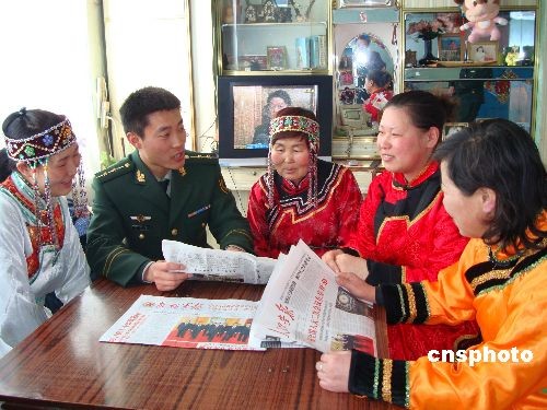 3月10日,黑龍江大興安嶺白銀納鄂倫春民族鄉(xiāng)邊防派出所官兵正在為鄂族群眾讀報(bào)!皟蓵(huì)”期間,大興安嶺白銀納鄂倫春民族鄉(xiāng)邊防派出所官兵積極向鄂倫春群眾宣傳兩會(huì)精神,和他們一起看電視、讀報(bào)紙,使他們及時(shí)了解國家的大政方針。中新社發(fā) 潘政坤 攝