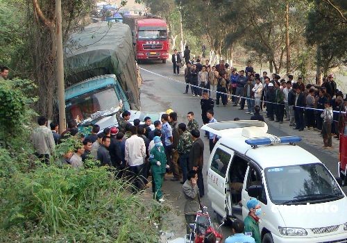 3月12日早上,廣西百色市田林縣境內(nèi)一輛奇瑞QQ小汽車在彎道處超車時(shí),不慎撞上迎面而來(lái)的一輛貴州籍大貨車,造成QQ車上兩人一死一傷。中新社發(fā) 唐廣斌 攝