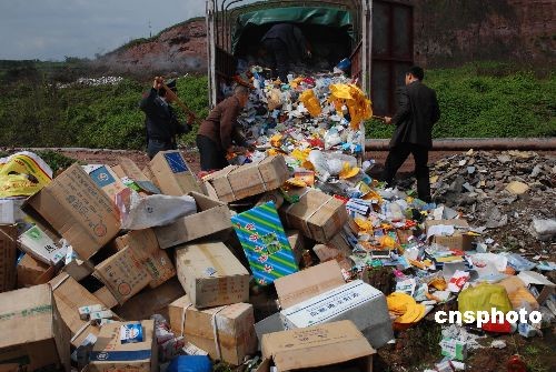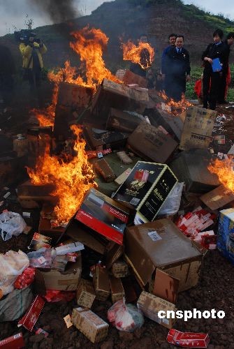 3月13日,重慶市璧山縣工商、質(zhì)監(jiān)、煙草等相關(guān)部門(mén)將收繳的假冒偽劣商品集中銷毀。據(jù)悉,此次被銷毀的偽劣商品有化妝品、日用品、假煙、假酒等539個(gè)品種。中新社發(fā) 謝捷 攝