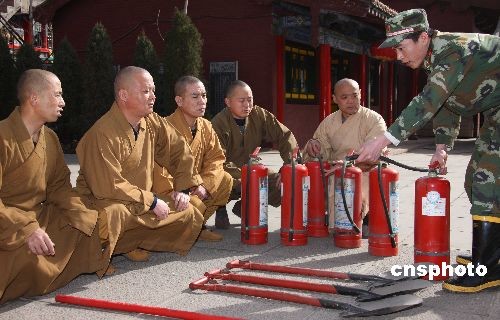 2009年3月17日,山西省盂縣永清寺院內(nèi),消防戰(zhàn)士在向僧人講解滅火器的正確使用方法。當(dāng)日,盂縣消防大隊開展“消防安全進寺廟”活動,消防戰(zhàn)士深入寺廟,手把手教僧人使用消防器材,現(xiàn)場培訓(xùn)僧人在火災(zāi)發(fā)生后第一時間內(nèi)協(xié)助消防員進行救援、緊急疏散的技能。中新社發(fā) 程瑜 攝