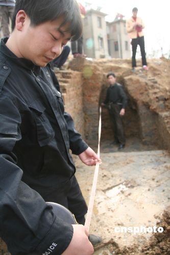 3月16日,施工人員在正在興建的安徽巢湖北外環(huán)施工工地發(fā)現(xiàn)兩座古墓。發(fā)掘的兩座古墓被確證為東漢晚期墓,其中一古墓葬為土坑墓,另一座為磚坑墓。據(jù)該市文管所同志介紹,這兩座漢墓均被盜過,而且被盜一空,在發(fā)掘時(shí),發(fā)現(xiàn)盜墓賊留下一個(gè)很大的盜洞,直通墓中央。從盜墓賊盜墓的舉動(dòng)和第二座漢墓墓磚結(jié)構(gòu)及墓磚上的花紋判斷,此墓墓主應(yīng)該有些身份,多少有些隨葬品,然而,發(fā)掘人員除了發(fā)掘出一些瓦罐的碎片,挖出惟一一只完整的陶罐。此只陶罐不是在墓坑挖出的,而是在墓坑外二十公分處。據(jù)文管所同志分析,此罐可能是后人祭祀留下的,或是盜墓賊丟下的。中新社發(fā) 李遠(yuǎn)波 攝