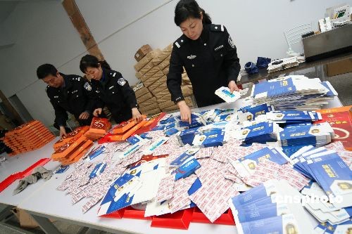 3月18日,河南許昌市魏都公安分局民警在涉嫌制造假藥窩點統(tǒng)計查獲的假藥及藥品標(biāo)簽、藥盒等。當(dāng)日,魏都警方接群眾舉報,在一閑置廠房內(nèi)查獲涉嫌制造假藥窩點,當(dāng)場查扣涉嫌假冒藥品10多種,半成品藥品、包裝箱、合格證、防偽標(biāo)識等1000多件,涉案值達(dá)2000余萬元。假冒藥品有五豆平糖膠囊、腎金子、腎黃金、協(xié)和降脂等10多種,藥效包含降壓、減肥、壯陽滋補(bǔ)等。藥品的制假技術(shù)很高,須借助儀器檢測才能區(qū)別。此案正在進(jìn)一步調(diào)查處理中。中新社發(fā) 牛書培 攝