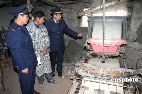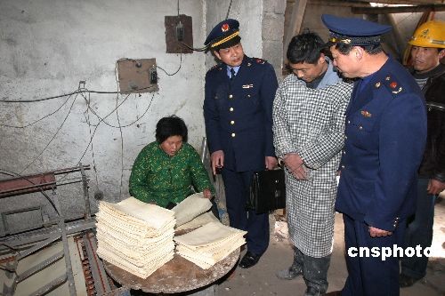 3月19日,江蘇連云港墟溝工商所在連云區(qū)城鄉(xiāng)結合部簡明平房查處一無證煎餅黑作坊。執(zhí)法人員現(xiàn)場發(fā)現(xiàn),原料庫內堆放著做煎餅的原料,原料包裝物上沒有任何標志,無合格證。加工間狹小、設備簡陋,隱蔽在簡易破舊的平房內,做飯、加工于一體。場所內兩口盛面糊的大缸周圍污穢不堪,污水遍地,衛(wèi)生狀況十分惡劣。煎餅主要送往城區(qū)市場、學校周邊及工業(yè)區(qū)外來人員上班經過的地方銷售。執(zhí)法人員當即責令煎餅作坊停止生產,并對加工機器予以查封。中新社發(fā) 王健民 攝