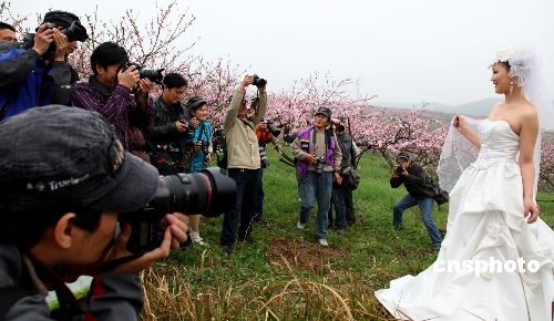 3月21日,攝影師們正在以婚紗美女為模特進(jìn)行拍攝。由宜昌市攝影家協(xié)會(huì)、三峽廣電新聞網(wǎng)及“真愛”婚紗攝影共同舉辦“三峽春天攝影大賽”日前在枝江萬畝桃花園開賽,百余名專業(yè)攝影師及攝影愛好者以攝影會(huì)友。 中新社發(fā) 望作信 攝