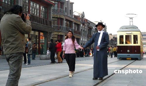 3月23日,在北京前門大街,一對(duì)年輕情侶身穿舊時(shí)中式服裝留影,吸引了過(guò)往行人的目光。 中新社發(fā) 玉龍 攝