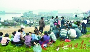 昨天下午4時許,記者在現(xiàn)場看到,300多名三水大塘的漁民聚集在北江邊。此后,村民登上已等候在北江邊的大船,乘船過江前往江河對面的大坑山墓群,那里就是林姓家族祖先墓穴之處。祭拜持續(xù)40分鐘左右結束,隨后村民乘船過江返回。