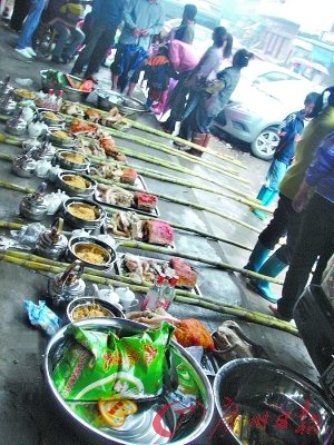 中標男青年告訴記者,之所以愿意以高價拍得一套百元左右的祭品,是因為這些祭品含有祖先庇佑的意頭。