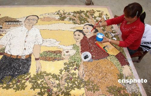 溫家寶總理兩度探望的四川大地震極重災(zāi)區(qū)青川縣黃坪鄉(xiāng),村民正用五谷雜糧制作大型粘貼畫(huà):“總理來(lái)到棗樹(shù)村”,藝術(shù)性再現(xiàn)他親臨棗樹(shù)村關(guān)心慰問(wèn)鄉(xiāng)民的情景。該畫(huà)高1.83米,寬3.05米,以木板為底,畫(huà)面色彩全部用當(dāng)?shù)厥a(chǎn)的玉米、黃豆、小豆、黑豆、蕎麥等二十多種雜糧拼貼,表達(dá)了村民與國(guó)家領(lǐng)導(dǎo)人的真摯樸實(shí)感情。中新社發(fā) 沈若飛 攝
